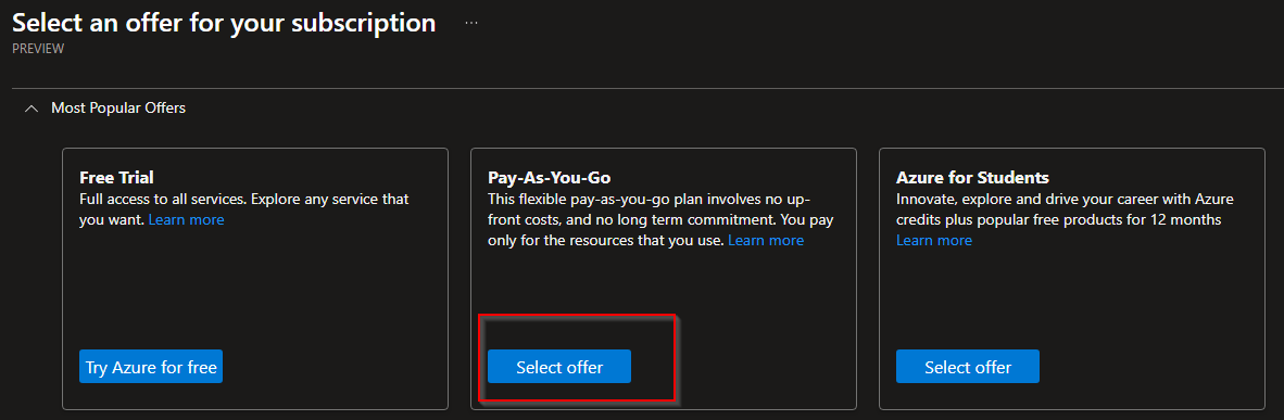 Next, select "Add" to add a subcription and select your offer. For this blog I will use "Pay as you go"