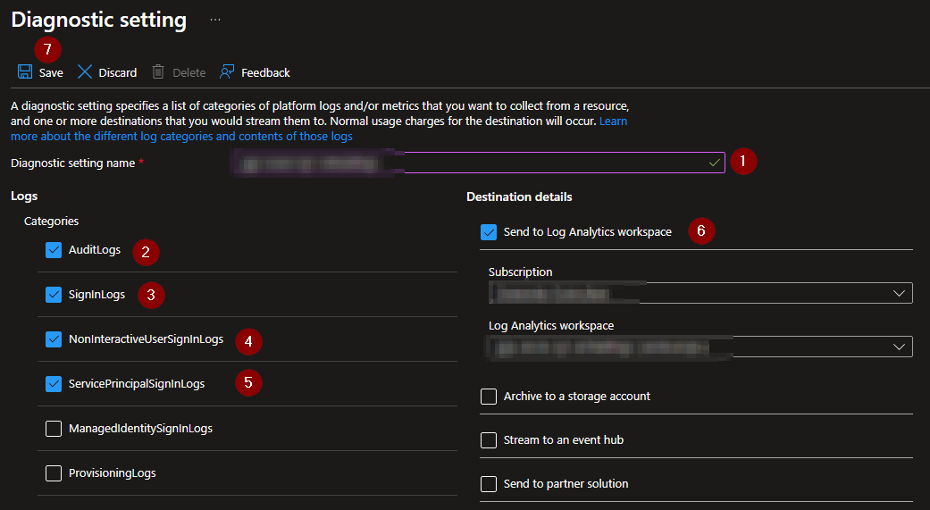 From the add diagnostic settings menu we can add the logs we want to sent to the workspace (for example sign-in logs, audit logs, ServicePrincipalSignInLogs). Select the logs you want to pass trough and select our just created Log Analytics Workspace. Next click "Save" and we're done!