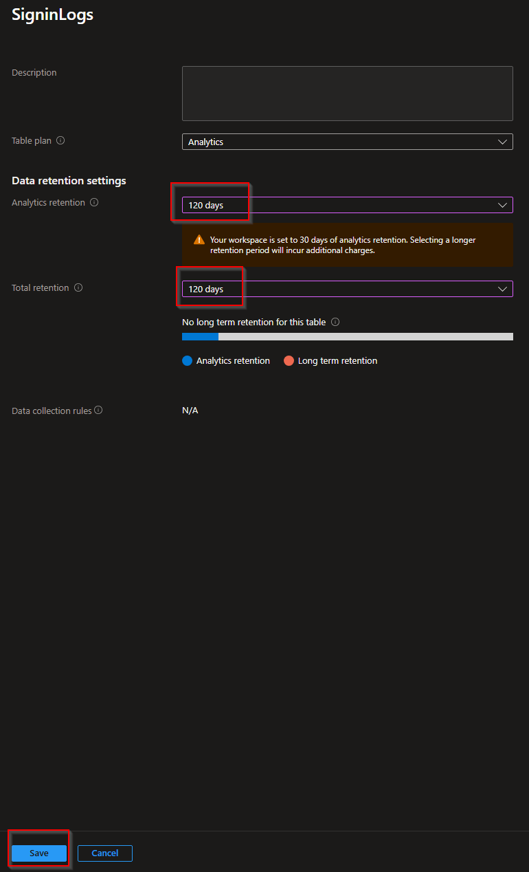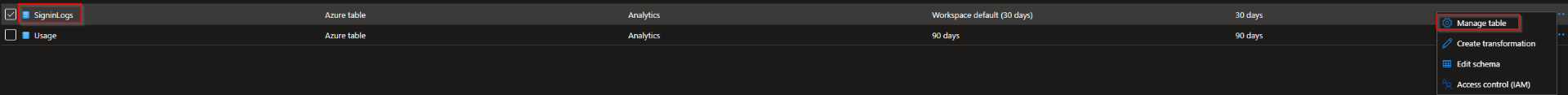 Select Manage table and set the retention you want to have configured for your Sign-In logs. For this blog I set the retention to 120 days. For the whole 120 days you are able to use queries with fast responds.