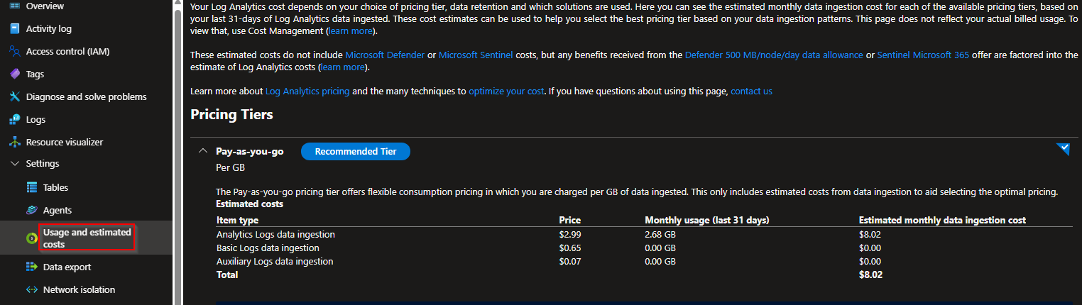 From the "Usage and estimated costs" menu you will be able to see your estimated costs for your logs. Usage will be charged by GB.