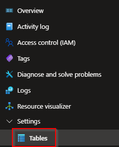 Now that we have forwarded our logs to the Log Analytics Workspace we want to make sure we extend the default of 30 days. To configure this browse to our just created Log Analytics Workspace. From the workspace go to "Tables" and select the log you want to extend.