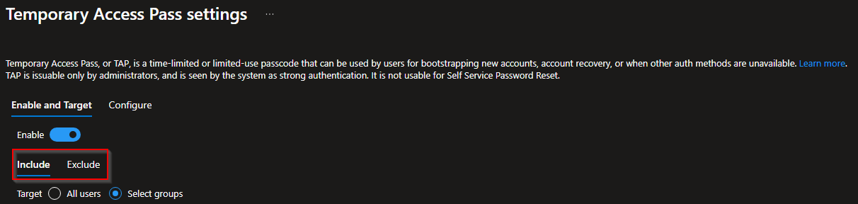 Authentication Policy Administrators: enable or disable TAP, include or exclude groups, and fine-tune the Authentication Methods policy for TAP.