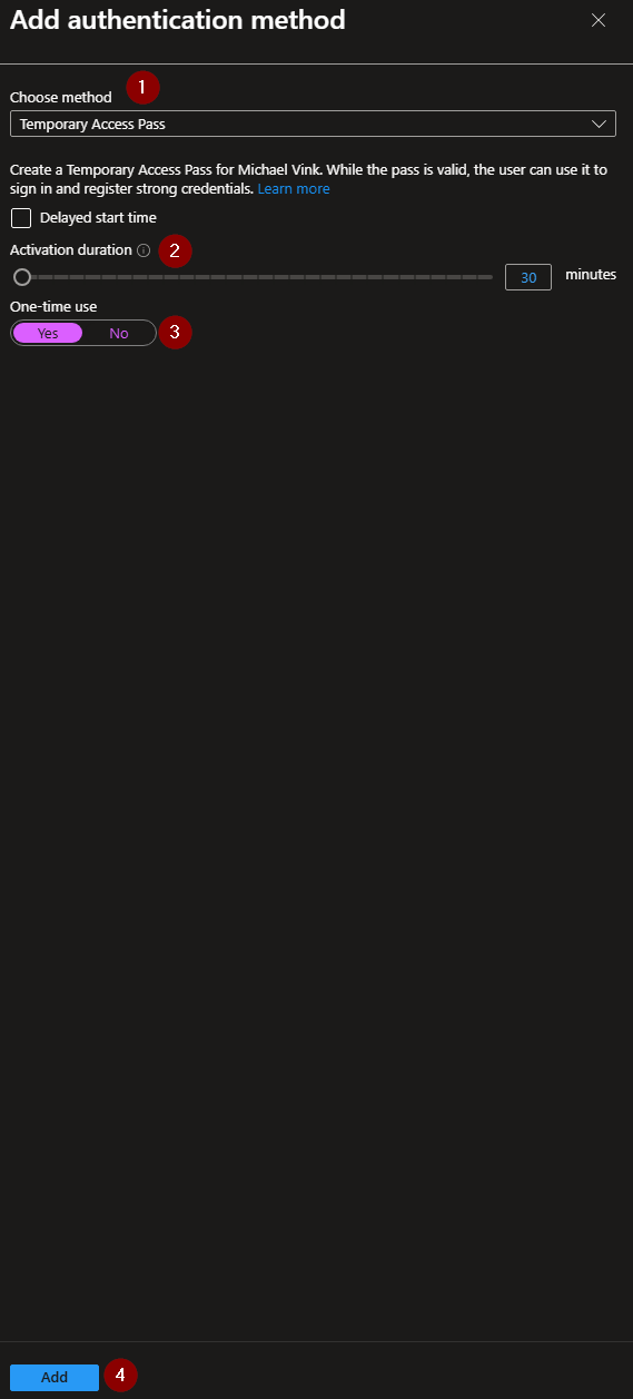 Next select "Temporary Access Pass" as method and configure the one-time use and the duration.