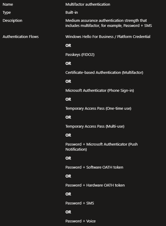 Because I like clean policies/auth methods I recommend creating a custom Authentication Strength where we will only configure those authentication flows that we want/are allowed to use.
