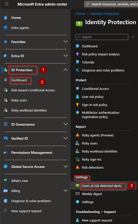 Browse to ID Protection -> Dashboard -> Under Settings, select "Users at risk detected alerts"