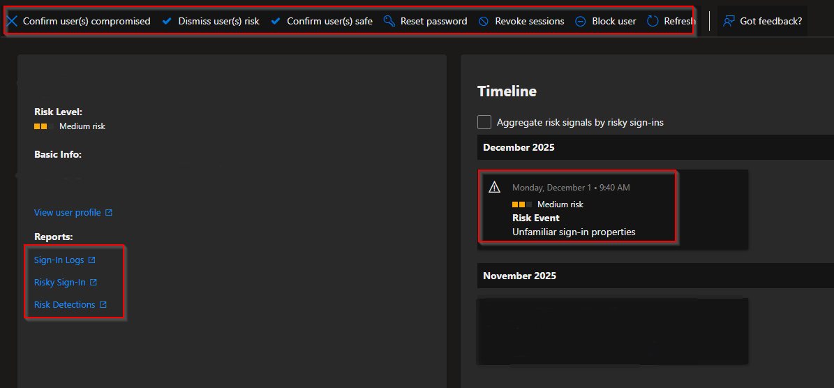 Risky users are user accounts that are being investigated by Microsoft and then flagged as possible compromised. Events like unfamiliar locations (impossible travel), unfamiliar sign-ins or failed login attempts but also events like leaked credentials or certain malicious patterns in a users sign-in (AiTM attack).