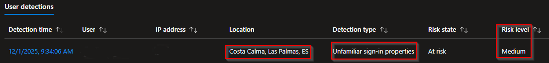 In the "Risk Detections" detail page we could see that this user has "Unfamiliar sign-in properties" and is trying to log in from Las Palmas: