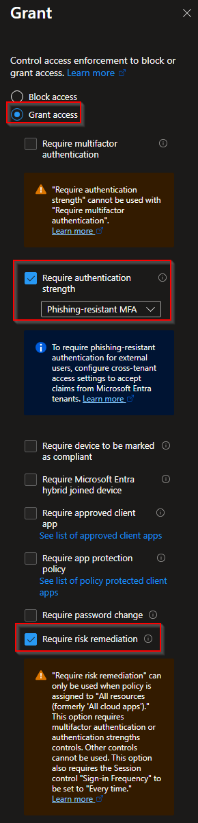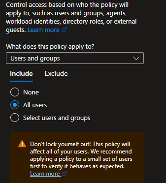 *Note2: Select which users/groups are using passwordless already in this policy as it can't be combined with the options I described above (Block). Also external and guest users must continue to self-remediate through secure password reset, as Microsoft Entra ID doesn't support session revocation for external and guest users.