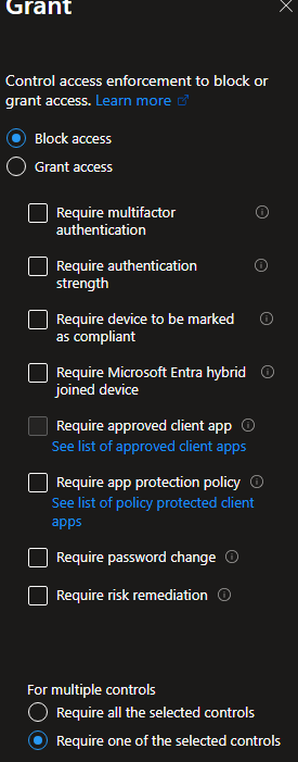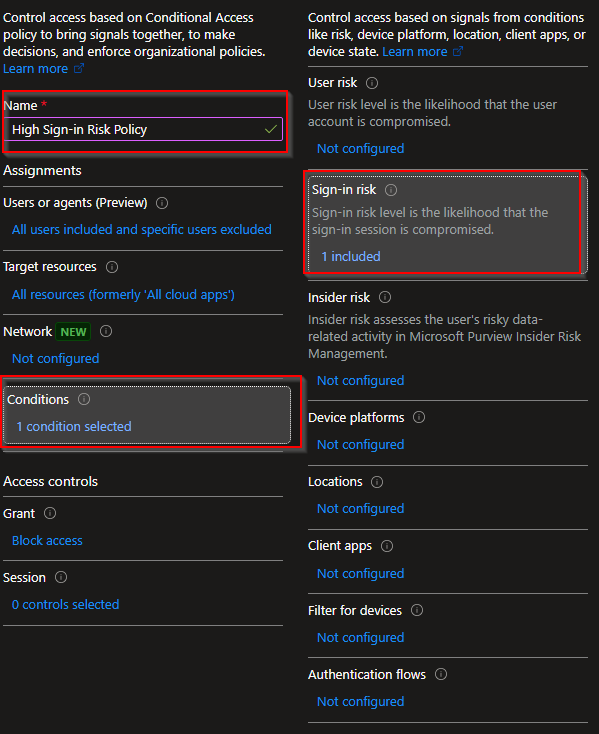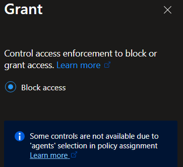 Microsoft also has options for creating CA policies for your (Risky) Agents which is currently in preview. There are some changes compared to the Risky Users CA policies. A Agent for example cannot initiate MFA. You can configure multiple options, for example block a High risk Agent or select agents acting as users. The following options can be configured: