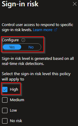 A user with the risk level classified as High have a significant unusual behavior indicating potential threats. Users with this classification often leads to immediate actions to make these accounts secure again. Some examples that can trigger a High risk are downloading large amounts of data, leaked credentials or impossible travel.*note: be aware that a user also can initiate a high risk by reporting themself a suspicious MFA prompt. Also you will need to configure CA policies to auto respond to a Risky user level. Per default Microsoft won't do anything if a Risky user is detected apart from sending you a notification (if configured).