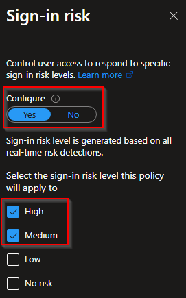 Follow these steps to make sure that a medium and high risk user (sign-in) will be automatically blocked from signing in. Because the steps are almost the same I will combine these two in this post but I strongly recommend creating two different CA policies: