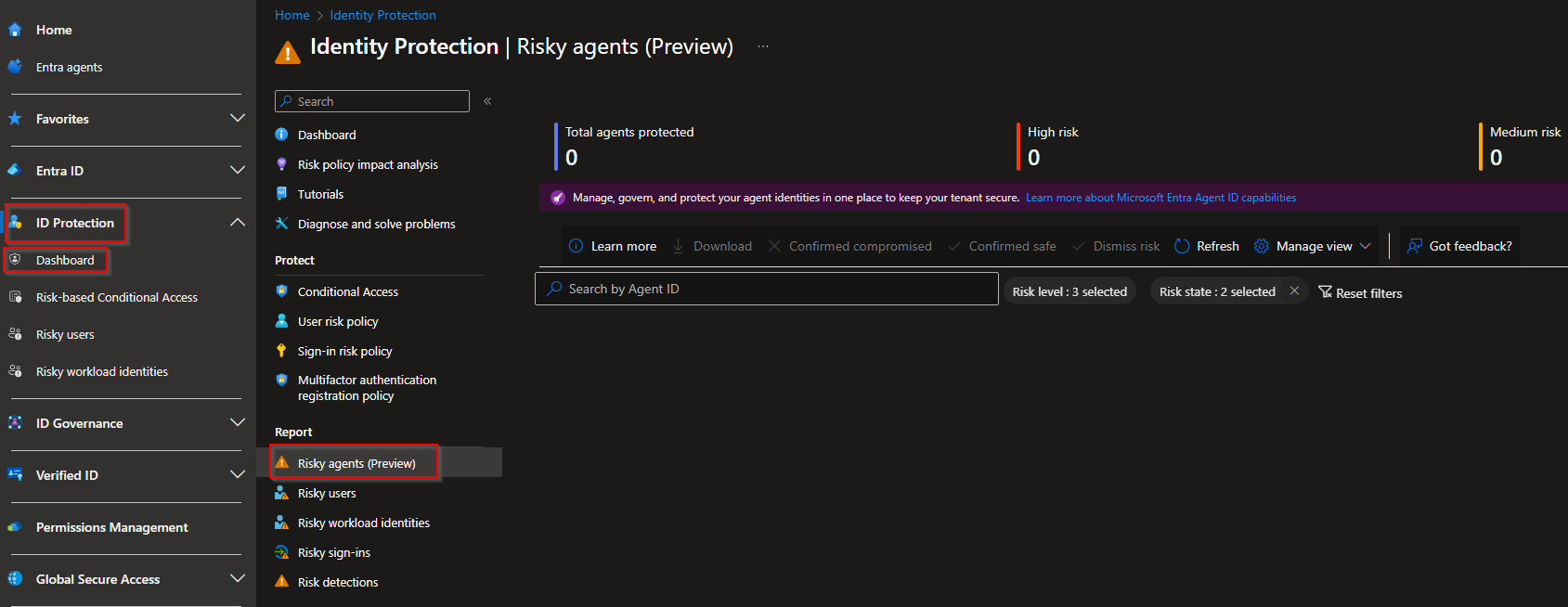 Browse to ID Protection -> Dashboard -> Under Report, select "Risky agents (Preview)"